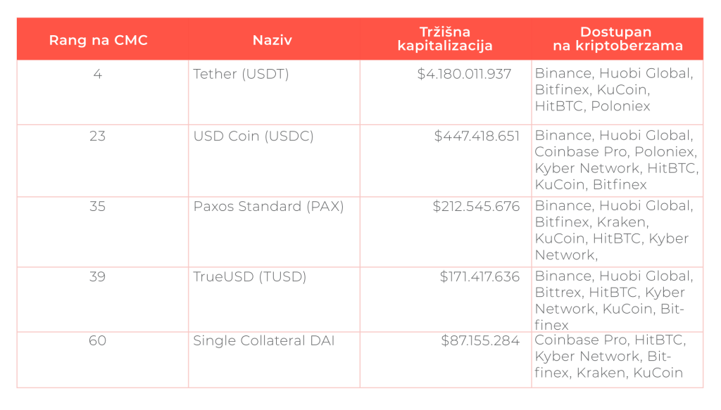 Prepoznajući potrebu za stabilnom kriptovalutom, koja bi bila transparentnija i bolje upravljana, na tržištu su se pojavili novi projekti stabilnih kriptovaluta. Trenutno, prema sajtu CoinMarketCap (CMC), u prvih 100 kriptovaluta po tržišnoj kapitalizaciji, čak 5 su stabilne kriptovalute (tabela u nastavku).