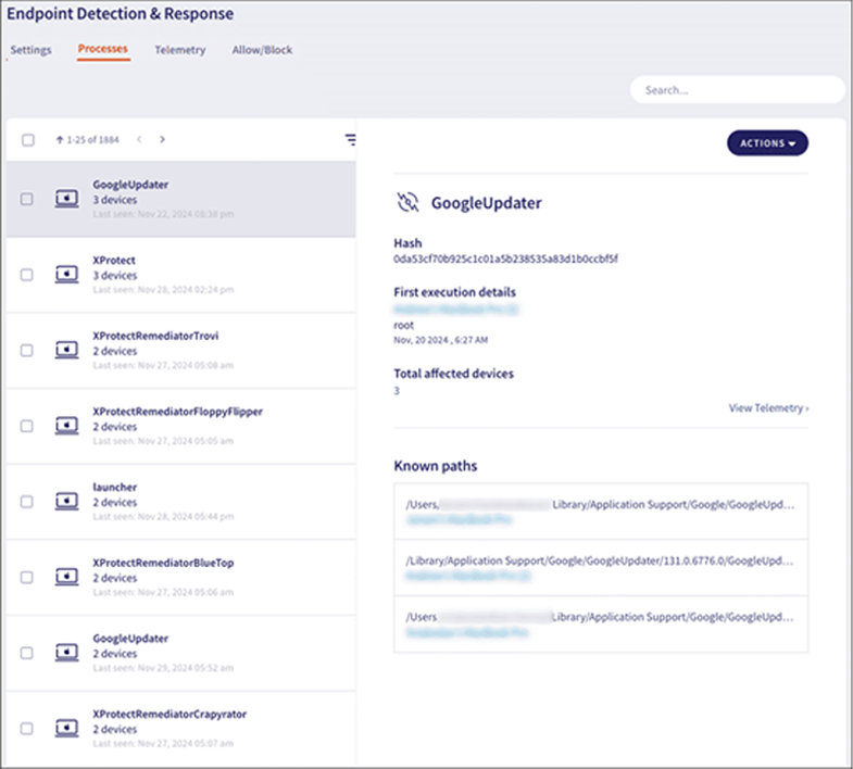 EDR modul prima podatke sa krajnjih uređaja koji su povezani na sistem. Ovakva kontekstualna analiza daje celokupnu sliku pretnji kojima je organizacija izložena, omogućavajući identifikovanje i upozoravanje na incidente u realnom vremenu. Rezultati analize prikazuju se u konzoli platforme, gde administratori mogu filtrirati podatke, dobiti smernice za sanaciju i odmah preduzeti akcije kao što su izolovanje uređaja sa mreže, gašenje uređaja ili blokiranje određenih procesa.