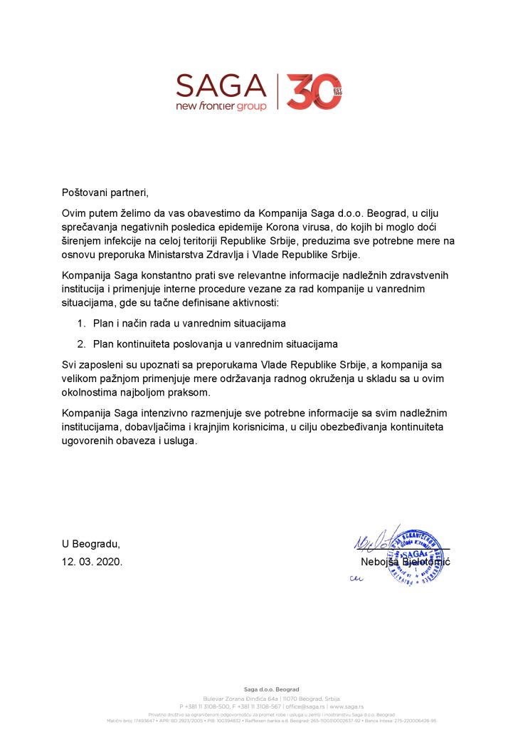 U nastavku možete pročitati zvaničan dopis naše kompanije na zvaničnom memorandumu, a koji se odnosi na poslovanje u uslovima COVID 19 virusa.